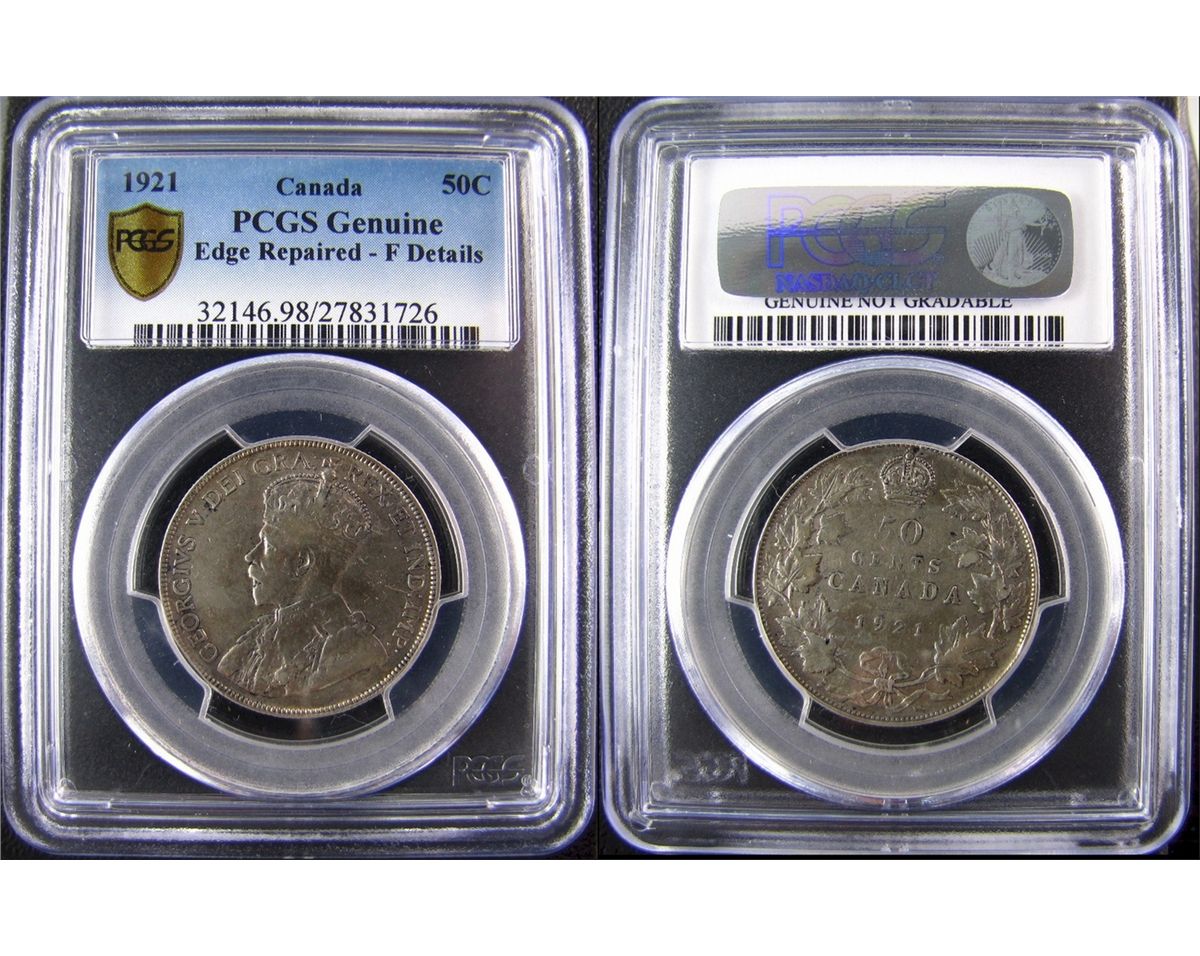 1921 50¢. The most sought after piece of all Canadian coins. A nice and attractive F to VF example. It has a minor flaw at 4 O'clock, but overall eye appeal is not compromised. The only example known in middle grade. Usually G to VG examples are foun