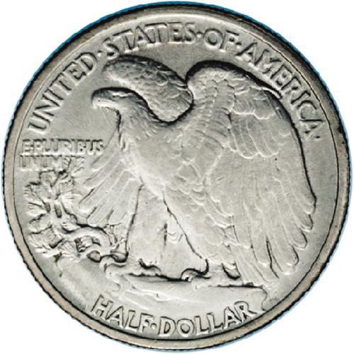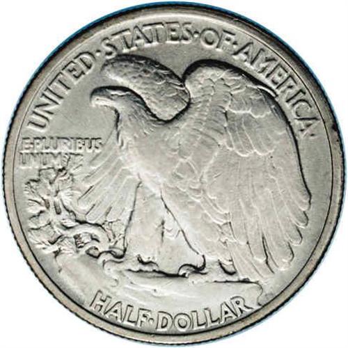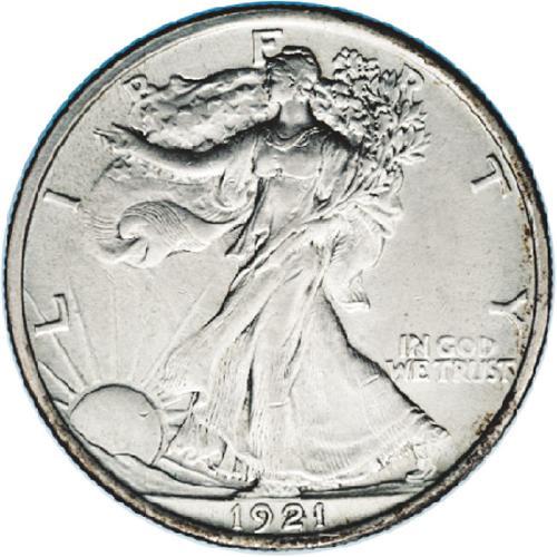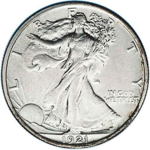 <B>1921<50C> AU Details, Improperly Cleaned, NCS.</B></I> Speckles of russet toning cling to the rims, although cream-gray color dominates. The eagle's breast has a trace of wear, but satiny luster extends through the fields, and the cleaning is so mild that most collectors would probably not even notice it. The three 1921-dated issues have a combined mintage of under 1 million pieces, and remain the traditional keys to the Walking Liberty series.