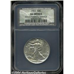 <B>1921<50C> AU50 Details, Environmental Damage, NCS.</B></I> This piece is fully struck and extremely well detailed, for an AU coin, but exhibits some minor environmental damage, perhaps from improper storage. Lightly toned, and showing faintly olive-gray coloration, there are some wispy hairlines in the obverse fields, and a few trivial contact marks exist on each side of the piece. An important low mintage (246,000), key date issue.<BR><I>From The Barry Donnell Collection, Part Two.</B></I> <BR><BR><B>Important notice:</B> Heritage usually auctions material at the rate of 200-250 lots per hour. On some occasions eBay Live bid software or the Internet may not be able to keep up with the pace of the auction. We recommend placing a realistic absentee bid now as insurance to avoid disappointment. Occasionally the auctioneer may eliminate or reject an eBay Live bid, and the auctioneer may also reopen a lot after the close of the eBay live bidding (usually because we missed an audience bid), and may reject your bid even if it shows you as the winning bidder. By bidding via eBay Live, you agree that Heritage may award the lot to another bidder at its sole discretion under the circumstances described above or any other reasonable circumstances. Since eBay bids are not shown to us until we open the lot on the floor, we treat those bids just like floor bids. In most cases the floor responds before the eBay bid is presented to us, due to Internet lag time, so for consistency we have made it a policy that floor bids are always considered first over tie eBay live bids. Also please note that all Heritage lots purchased through eBay Live carry a 20% Buyer's Premium. Please make sure you read the Terms and Conditions before you bid. </span></font></tr></table></td></tr></table>
