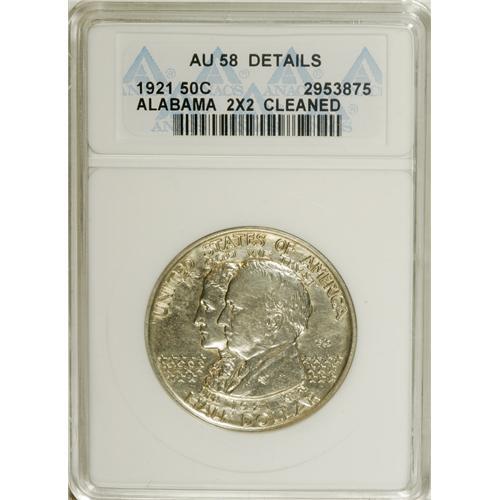 <B>1921 50C Alabama 2x2--Cleaned--ANACS. AU58 Details.</B></I> NGC Census: (25/1364). PCGS Population (43/1797). Mintage: 6,006. Numismedia Wsl. Price: $250. (#9225)<BR><BR><b>Shipping:</b> Coins & Currency (<a target="_blank" href="http://www.heritageauctions.com/common/shipping.php">view shipping information</a>)