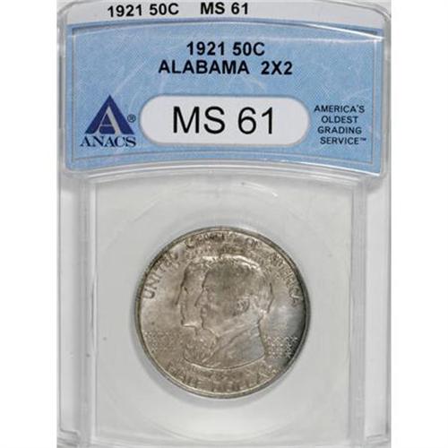 <B>1921 50C Alabama 2x2 MS61 ANACS.</B></I> NGC Census: (10/1389). PCGS Population (20/1775). Mintage: 6,006. Numismedia Wsl. Price for NGC/PCGS coin in MS61: $352. (#9225)<BR><BR><b>Shipping:</b> Coins & Currency (<a target="_blank" href="http://www.heritageauctions.com/common/shipping.php">view shipping information</a>)