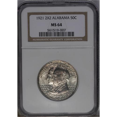 <B>1921<50C> Alabama 2x2 MS64 NGC.</B></I> Mint-green toning yields to rose coloration near the obverse center. Satiny and typically well struck with a few wispy slide marks on the obverse that prevent a higher grade assessment.