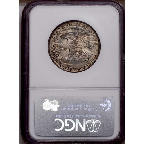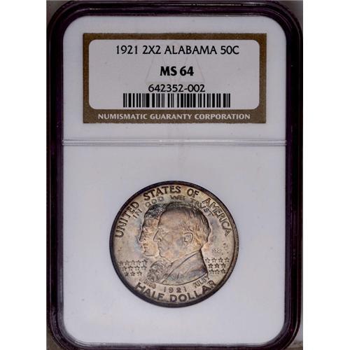 <B>1921<50C> Alabama 2x2 MS64 NGC.</B></I> Powder-blue, peach, and yellow-gray alternate on this intricately struck and satiny Choice Alabama half dollar, which is refreshingly devoid of relevant contact. The marketing ploy of adding "2x2" in the field, indicating the state's admission order into the Union, was used to increase sales. The 2x2 variety was limited to 6,000 strikes, plus six assay pieces.