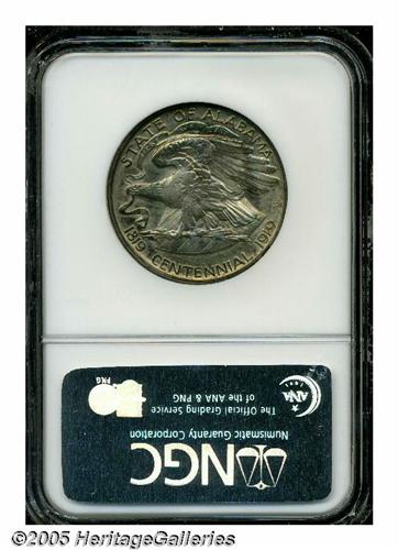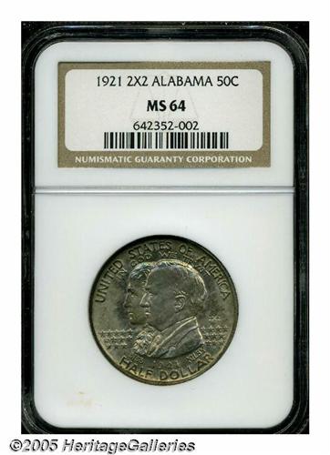 <B>1921<50C> Alabama 2x2 MS64 NGC.</B></I> This Alabama commemorative displays golden-gray toning with accents of cobalt-blue and lavender. The design features are adequately struck, except for the usual softness on the eagle's breast feathers. The lustrous surfaces are relatively well preserved, revealing no serious abrasions. A couple of minute marks on Kilby's forehead and cheek are mentioned for accuracy.