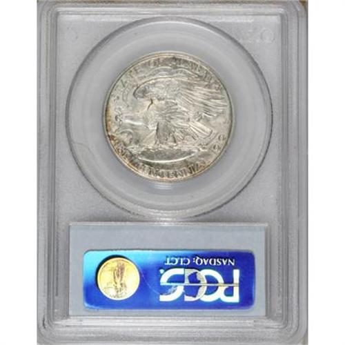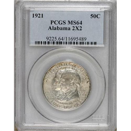 <B>1921 50C Alabama 2x2 MS64 PCGS.</B></I> Violet and gold peripheral accents enliven the central powder-blue and silver-gray colors of this near-Gem. A well-defined representative of this early Laura Gardin Fraser design with few marks overall.<BR><BR><b>Shipping:</b> Coins & Currency (<a target="_blank" href="http://www.heritageauctions.com/common/shipping.php">view shipping information</a>)