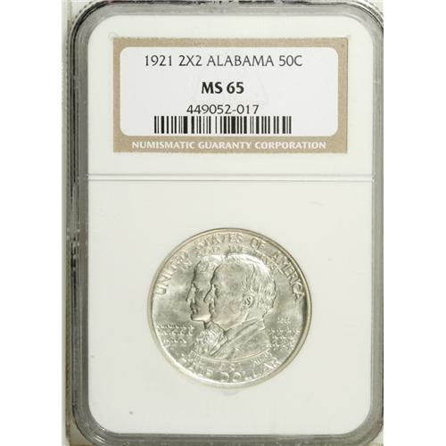 <B>1921 50C Alabama 2x2 MS65 NGC.</B></I> Bright luster radiates from untoned surfaces, and the design features are well executed. A few inoffensive marks keep this lovely commemorative from an even higher grade.<BR><BR><b>Shipping:</b> Coin/Currency (<a target="_blank" href="http://www.heritageauctions.com/common/shipping.php">view shipping information</a>)