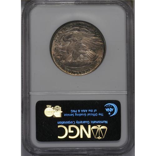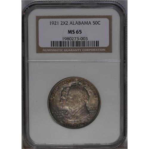 <B>1921<50C> Alabama 2x2 MS65 NGC.</B></I> Creamy gray-gold toning drapes this shimmering silver commemorative. The strike is good aside from the eagle's back claw, and a few small marks on Governor Kilby are inconspicuous.