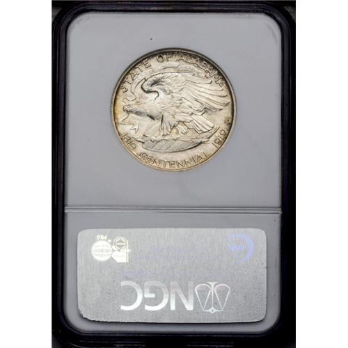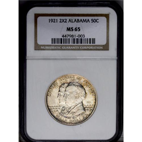 <B>1921<50C> Alabama 2x2 MS65 NGC.</B></I> Highly lustrous surfaces display splotches of golden-brown, cobalt-blue, and lavender patina, mostly around the borders. Both sides are devoid of significant marks. <BR><BR><B>Important notice:</B> Heritage usually auctions material at the rate of 200-250 lots per hour. On some occasions eBay Live bid software or the Internet may not be able to keep up with the pace of the auction. We recommend placing a realistic absentee bid now as insurance to avoid disappointment. Occasionally the auctioneer may eliminate or reject an eBay Live bid, and the auctioneer may also reopen a lot after the close of the eBay live bidding (usually because we missed an audience bid), and may reject your bid even if it shows you as the winning bidder. By bidding via eBay Live, you agree that Heritage may award the lot to another bidder at its sole discretion under the circumstances described above or any other reasonable circumstances. Since eBay bids are not shown to us until we open the lot on the floor, we treat those bids just like floor bids. In most cases the floor responds before the eBay bid is presented to us, due to Internet lag time, so for consistency we have made it a policy that floor bids are always considered first over tie eBay live bids. Also please note that all Heritage lots purchased through eBay Live carry a 20% Buyer's Premium. Please make sure you read the Terms and Conditions before you bid. This lot is being auctioned in conjunction with a live floor auction by Heritage Galleries & Auctioneers. All final auction and invoice information will be supplied by Heritage Galleries & Auctioneers, and all other information should be considered preliminary. Lot:4850 <BR><BR><B>Winning Notification and Billing:</B> After the FINAL session in this auction is complete, Heritage will send e-mail and snail mail invoices. This process normally takes several days. All final auction and invoice information will be supplied by Heritage Galleries & Auctioneers, and all other information should be considered preliminary. <BR><BR>This auction will be conducted on a live auction floor and over the Internet through eBay Live. If you choose to place an absentee bid, please take a moment to <font color='#0000ff'><u><a href='http://pages.ebay.com/liveauctions/help/before/laabsentee.html'>learn how eBay Live absentee bidding works</a></u></font><font color='#000000'>