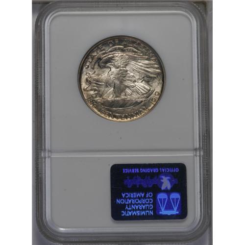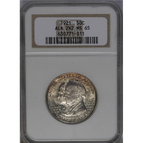 <B>1921<50C> Alabama 2x2 MS65 NGC.</B></I> This is the variety with the small 2x2 symbol in the right obverse field, marking Alabama as the 22nd state in the Union. A frosty Gem Mint State example with mostly brilliant silver surfaces, accented by peripheral golden-brown color on the obverse, and smooth champagne toning across the reverse.