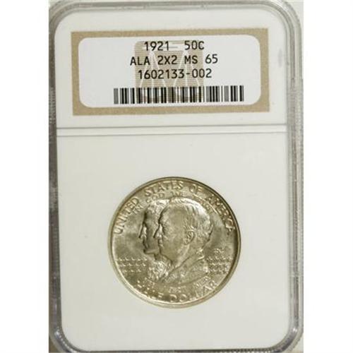<B>1921 50C Alabama 2x2 MS65 NGC.</B></I> This low-mintage variant, which amounted to just 6,006 pieces, was part of a trend for distributors to create multiple varieties with subtle differences to extract more revenue from collectors. The softly lustrous surfaces have a touch of tan-gold color on the obverse and a hint of olive on the opposite side.<BR><I>From The Silver Fox Collection.</B></I><BR><BR><b>Shipping:</b> Coins & Currency (<a target="_blank" href="http://www.heritageauctions.com/common/shipping.php">view shipping information</a>)