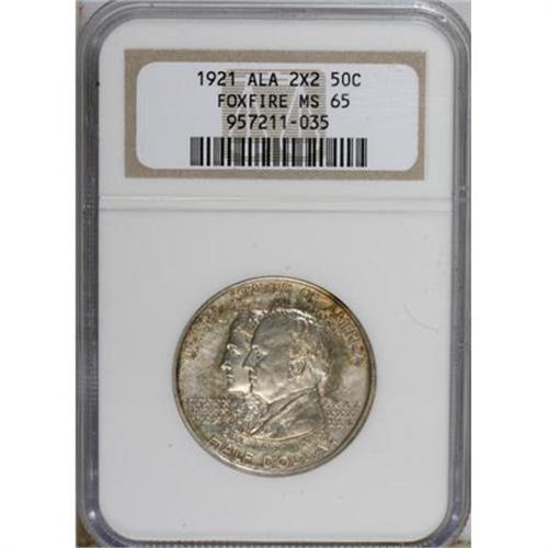 <B>1921 50C Alabama 2x2 MS65 NGC.</B></I> Ex: Foxfire. Khaki-gold and sky-blue adorn this shimmering and sharply struck Gem. Only 6,000 pieces were struck of the 2x2 variety, discounting the six pieces destined for assay.<BR><BR><b>Shipping:</b> Coins & Currency (<a target="_blank" href="http://www.heritageauctions.com/common/shipping.php">view shipping information</a>)