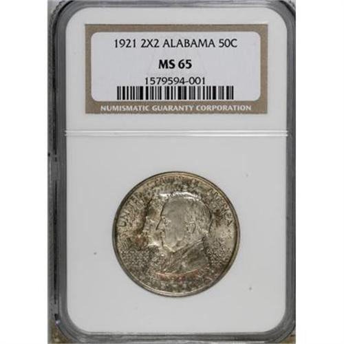 <B>1921 50C Alabama 2x2 MS65 NGC.</B></I> A well struck, subtly lustrous Gem example of this prized Alabama variant. Peach and silver-blue patina predominates on the obverse, while the reverse is primarily steel-gray.<BR><BR><b>Shipping:</b> Coins & Currency (<a target="_blank" href="http://www.heritageauctions.com/common/shipping.php">view shipping information</a>)