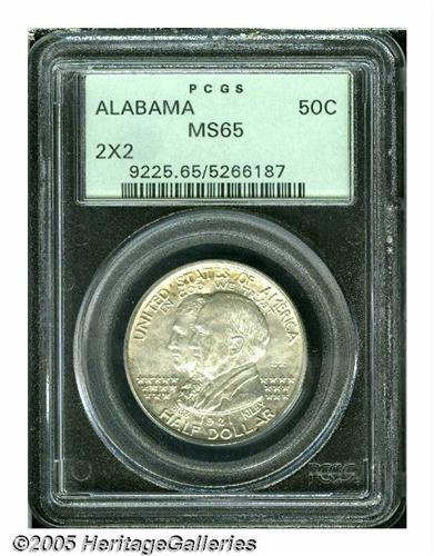 <B>1921<50C> Alabama 2x2 MS65 PCGS.</B></I> A key date in the silver commemorative series with only 6,006 pieces issued. Hints of ice-blue and faint olive toning rest over lustrous surfaces. The design elements are well defined throughout, and the surfaces are relatively well preserved, displaying just a few minute marks on the obverse portraits.