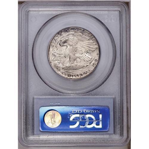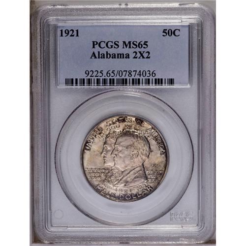 <B>1921<50C> Alabama 2x2 MS65 PCGS.</B></I> Gem Alabama 2x2's with good eye appeal, such as the present example, are always in demand on the bourse floor. This piece boasts brilliant luster that is unimpeded by moderately deep amber-gold toning that is confined largely to the obverse, while the reverse is a lovely, brilliant silver-blue. This example reveals few distractions under a loupe, save for the ever-present strike weakness on the eagle's talons. PCGS has graded 61 finer (3/06). <BR><BR><B>Important notice:</B> Heritage usually auctions material at the rate of 200-250 lots per hour. On some occasions eBay Live bid software or the Internet may not be able to keep up with the pace of the auction. We recommend placing a realistic absentee bid now as insurance to avoid disappointment. Occasionally the auctioneer may eliminate or reject an eBay Live bid, and the auctioneer may also reopen a lot after the close of the eBay live bidding (usually because we missed an audience bid), and may reject your bid even if it shows you as the winning bidder. By bidding via eBay Live, you agree that Heritage may award the lot to another bidder at its sole discretion under the circumstances described above or any other reasonable circumstances. Since eBay bids are not shown to us until we open the lot on the floor, we treat those bids just like floor bids. In most cases the floor responds before the eBay bid is presented to us, due to Internet lag time, so for consistency we have made it a policy that floor bids are always considered first over tie eBay live bids. Also please note that all Heritage lots purchased through eBay Live carry a 20% Buyer's Premium. Please make sure you read the Terms and Conditions before you bid. This lot is being auctioned in conjunction with a live floor auction by Heritage Galleries & Auctioneers. All final auction and invoice information will be supplied by Heritage Galleries & Auctioneers, and all other information should be considered preliminary. Lot:4849 <BR><BR><B>Winning Notification and Billing:</B> After the FINAL session in this auction is complete, Heritage will send e-mail and snail mail invoices. This process normally takes several days. All final auction and invoice information will be supplied by Heritage Galleries & Auctioneers, and all other information should be considered preliminary. <BR><BR>This auction will be conducted on a live auction floor and over the Internet through eBay Live. If you choose to place an absentee bid, please take a moment to <font color='#0000ff'><u><a href='http://pages.ebay.com/liveauctions/help/before/laabsentee.html'>learn how eBay Live absentee bidding works</a></u></font><font color='#000000'>