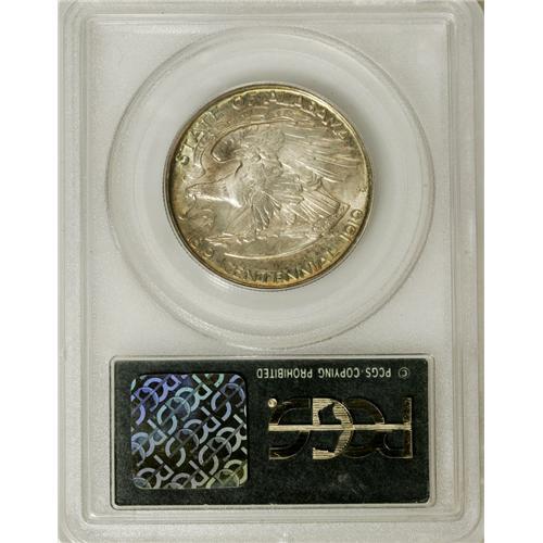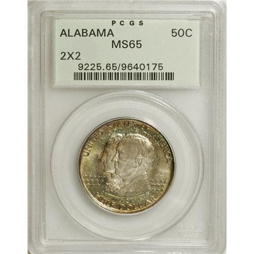 <B>1921 50C Alabama 2x2 MS65 PCGS.</B></I> The 2x2 variety was one of the early "special" issues created to sell two coins to one collector. This satiny and well struck Gem has soft greenish-gold and aqua patina over the luminous surfaces. A tiny graze on Kilby's chin precludes an even finer grade.<BR><I>From The Cary & Cheryl Porter Collection.</B></I><BR><BR><b>Shipping:</b> Coins & Currency (<a target="_blank" href="http://www.heritageauctions.com/common/shipping.php">view shipping information</a>)