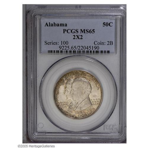<B>1921<50C> Alabama 2x2 MS65 PCGS.</B></I> There are remarkably few abrasions on the sharply defined surfaces of this conditionally scarce example. The warmly toned, golden-gray features exhibit somewhat more vibrant colors around the borders. Worthy of a strong bid.