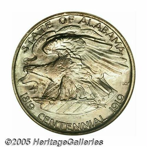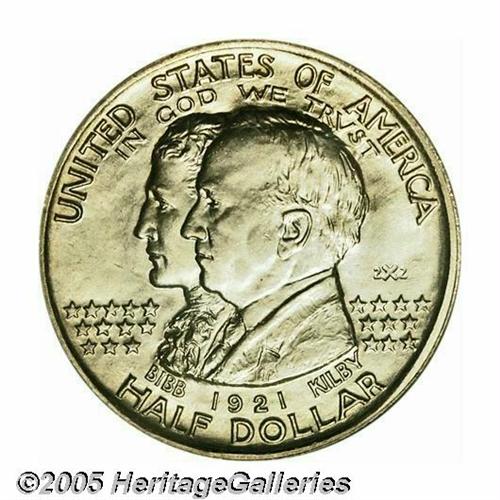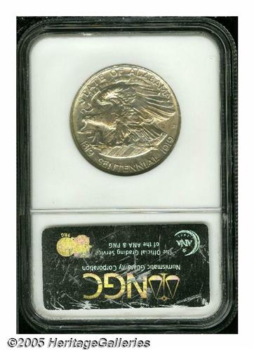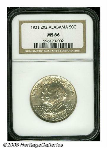 <B>1921<50C> Alabama 2x2 MS66 NGC.</B></I> Both sides of this Premium Gem display a strong strike with virtually complete feathers on the eagle and solid detail on Governor Kilby's portrait. Delicate golden-lilac toning on the reverse adds a nice touch of color to this impressive, low mintage commemorative, one of a mere 6,006 pieces struck. Population: 35 in 66, 1 finer (5/05).
