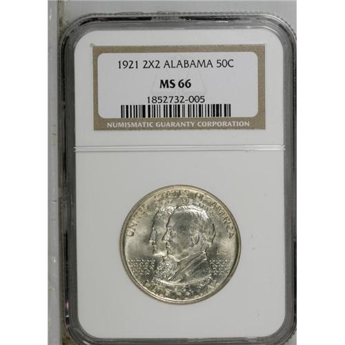 <B>1921 50C Alabama 2x2 MS66 NGC.</B></I> While controversy exists over the number of Alabama 2x2 commemorative half dollars that were minted (6,006 vs.15,014 pieces), this issue still remains one of the lowest minted of the classic commemorative series. Bright luster and a thin film of champagne-gold toning characterize each side, and the design elements depict nice definition. A scattering of light facial marks on Kilby's head do not deny the Premium Gem grade designation. Census: 55 in 66, 1 finer (10/06).<BR><BR><b>Shipping:</b> Coin/Currency (<a target="_blank" href="http://www.heritageauctions.com/common/shipping.php">view shipping information</a>)