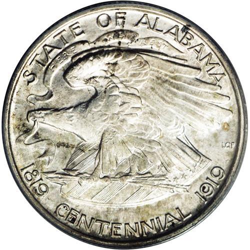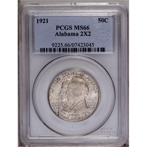 <B>1921<50C> Alabama 2x2 MS66 PCGS.</B></I> Both sides offer a hint of silver-gray patina, with a touch of amber-gold at the lower obverse rim. This coin shows unusually bold definition in the centers, and a noteworthy lack of mentionable abrasions. There are grease stains near the border of each side that have no ill effect on this coin's impressive technical merits. An outstanding survivor from a limited mintage of just 6,006 pieces. <BR><BR><B>Important notice:</B> Heritage usually auctions material at the rate of 200-250 lots per hour. On some occasions eBay Live bid software or the Internet may not be able to keep up with the pace of the auction. We recommend placing a realistic absentee bid now as insurance to avoid disappointment. Occasionally the auctioneer may eliminate or reject an eBay Live bid, and the auctioneer may also reopen a lot after the close of the eBay live bidding (usually because we missed an audience bid), and may reject your bid even if it shows you as the winning bidder. By bidding via eBay Live, you agree that Heritage may award the lot to another bidder at its sole discretion under the circumstances described above or any other reasonable circumstances. Since eBay bids are not shown to us until we open the lot on the floor, we treat those bids just like floor bids. In most cases the floor responds before the eBay bid is presented to us, due to Internet lag time, so for consistency we have made it a policy that floor bids are always considered first over tie eBay live bids. Also please note that all Heritage lots purchased through eBay Live carry a 20% Buyer's Premium. Please make sure you read the Terms and Conditions before you bid. This lot is being auctioned in conjunction with a live floor auction by Heritage Galleries & Auctioneers. All final auction and invoice information will be supplied by Heritage Galleries & Auctioneers, and all other information should be considered preliminary. Lot:4851 <BR><BR><B>Winning Notification and Billing:</B> After the FINAL session in this auction is complete, Heritage will send e-mail and snail mail invoices. This process normally takes several days. All final auction and invoice information will be supplied by Heritage Galleries & Auctioneers, and all other information should be considered preliminary. <BR><BR>This auction will be conducted on a live auction floor and over the Internet through eBay Live. If you choose to place an absentee bid, please take a moment to <font color='#0000ff'><u><a href='http://pages.ebay.com/liveauctions/help/before/laabsentee.html'>learn how eBay Live absentee bidding works</a></u></font><font color='#000000'>
