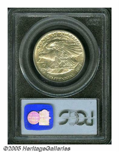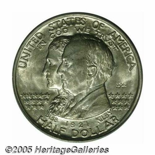 <B>1921<50C> Alabama 2x2 MS66 PCGS.</B></I> Delicately toned in apricot hues, this lustrous premium Gem features a pristine reverse and a clean obverse. A faint vertical graze to the left of the ear does not distract. The low mintage 2x2 Alabama pieces are generally well struck on the eagle's body and claws, unlike their non 2x2 counterparts.