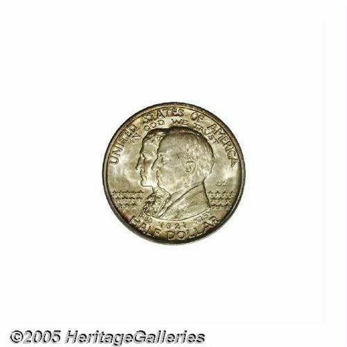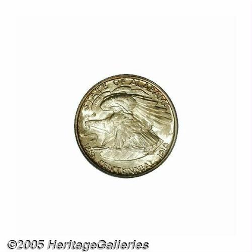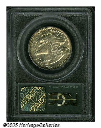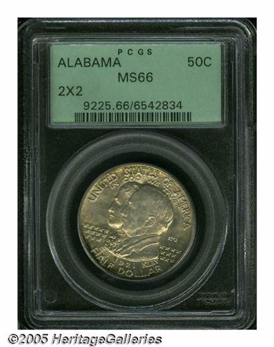 <B>1921<50C> Alabama 2x2 MS66 PCGS.</B></I> Extremely well struck for this scarcer variety, one of just 6,006 pieces struck, with frosty features that are basically untoned and peripheral specks of orange and green iridescence along the base of each side. A few tiny blemishes are found on Kilby's cheek and below the eagle's neck, but these trivial distractions are easily offset by the coin's vibrant, original appearance. Population: 53 in 66, 4 finer (5/05).