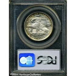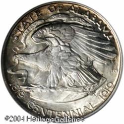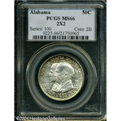 1921 50C Alabama 2x2 MS66 PCGS. Extremely well str <B>1921 50C Alabama 2x2 MS66 PCGS.</B></I> Extremely well struck for this scarcer variety, one of just 6,006 pieces struck, with frosty features that are basically untoned and the slightest dusting of lime-golden patina at the borders. Population: 52 in 66, 4 finer (10/04). <BR><BR><B>Important notice:</B> Heritage usually auctions material at the rate of 200-250 lots per hour. On some occasions eBay Live bid software or the Internet may not be able to keep up with the pace of the auction. We recommend placing a realistic absentee bid now as insurance to avoid disappointment. Occasionally the auctioneer may eliminate or reject an eBay Live bid, and the auctioneer may also reopen a lot after the close of the eBay live bidding (usually because we missed an audience bid), and may reject your bid even if it shows you as the winning bidder. By bidding via eBay Live, you agree that Heritage may award the lot to another bidder at its sole discretion under the circumstances described above or any other reasonable circumstances. Since eBay bids are not shown to us until we open the lot on the floor, we treat those bids just like floor bids. In most cases the floor responds before the eBay bid is presented to us, due to Internet lag time, so for consistency we have made it a policy that floor bids are always considered first over tie eBay live bids. Also please note that all Heritage lots purchased through eBay Live carry a 20% Buyer's Premium. Please make sure you read the Terms and Conditions before you bid. This lot is being auctioned in conjunction with a live floor auction by Heritage Galleries & Auctioneers. All final auction and invoice information will be supplied by Heritage Galleries & Auctioneers, and all other information should be considered preliminary. Lot:7844