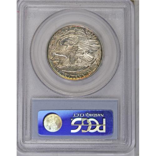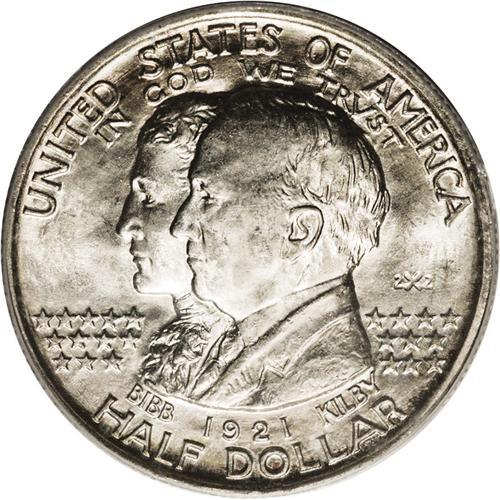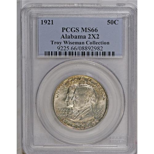 <B>1921<50C> Alabama 2x2 MS66 PCGS.</B></I> Glorious gray-gold surfaces, accented with tinges of aqua, offer scintillating luster and a paucity of all but the most minuscule abrasions. A sharp strike makes even the eagle's claws, often mere blobs, much crisper than usually seen. A curious thin, straight line of dark toning runs from 1 to 4 o'clock on the reverse: perhaps an old envelope mark? PCGS has graded five pieces finer (8/06).<BR><I>From The Troy Wiseman Collection.</B></I>