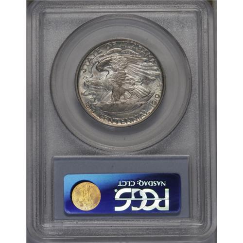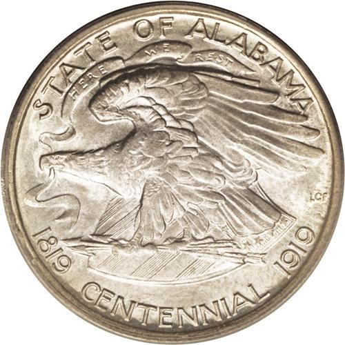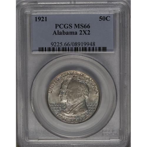 <B>1921<50C> Alabama 2x2 MS66 PCGS.</B></I> Premium Gem and better 2x2 Alabama commemoratives are difficult to come by. Indeed, NGC and PCGS combined have certified just over than 100 pieces in MS66, many of which are likely resubmissions, and a mere six coins finer. This specimen displays bright, lustrous surfaces that are touched by delicate wisps of silver-gray patina. All of the design elements are sharply impressed, and the well preserved surfaces are devoid of significant marks. Population: 58 in 66, 5 finer (5/06).