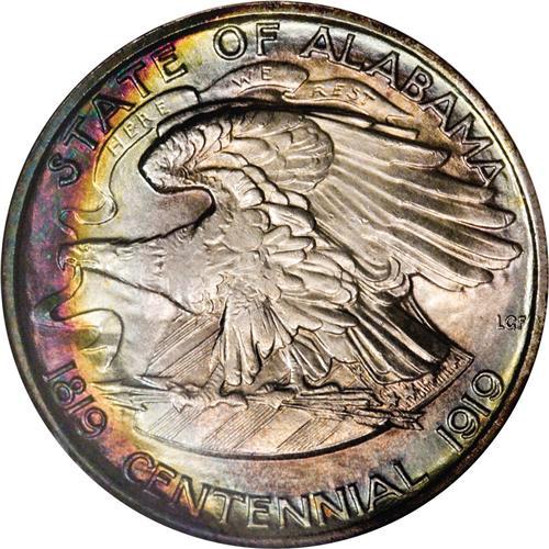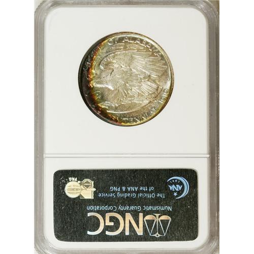 <B>1921 50C Alabama 2x2 MS66 <img border='0' src='http://www.heritagecoins.com/images/star.gif' width=10 height=10> NGC.</B></I> While numismatists know Governor Thomas Kilby as the first living person to appear on a U.S. coin, this hardly does justice to his political and business careers, which included time as a mayor, lieutenant governor, bank president, and minor steel magnate, according to the Alabama Department of Archives & History. Kilby joins his earliest predecessor on the obverse of this stupendous half. Crescents of lime-green, plum, ruby-magenta, orange, and gold grace the left side, while the rest is mainly silver-white. One of just six Alabama 2x2 halves in MS66 awarded the Star designation, and the lone Superb Gem graded by NGC lacks the Star (3/07).<BR><I>From The Cary & Cheryl Porter Collection.</B></I><BR><BR><b>Shipping:</b> Coins & Currency (<a target="_blank" href="http://www.heritageauctions.com/common/shipping.php">view shipping information</a>)