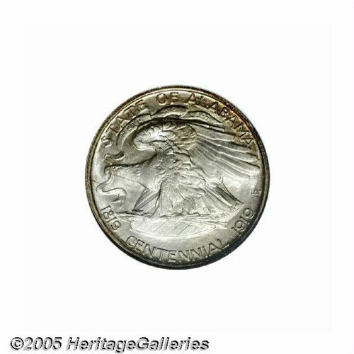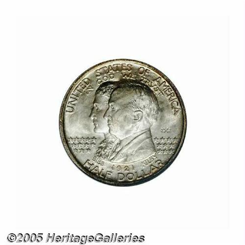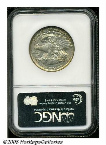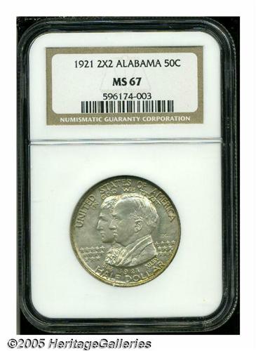 <B>1921<50C> Alabama 2x2 MS67 NGC.</B></I> The state of Alabama joined the union in 1819 with its centennial celebration taking place in 1919. Both of these dates were incorporated into the design, despite the coining not being issued until 1921. This variety, with 2x2 in the right obverse field, was created in an effort to increase sales and fund-raising. According to legislation, profits from this issue were destined to support historical and monumental projects. Today, we must question whether these projects actually took place.<BR> This is only the sixth time that we have offered a Superb Gem MS67 example of this issue over the past dozen years. Both sides have pastel gray-golden toning with signs of deeper peripheral iridescence. Beneath the toning, the surfaces display exceptional satiny luster. We cannot imagine a finer example for the connoisseur. Population by both services combined: 5 in 67, none are finer (5/05).