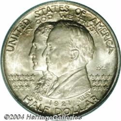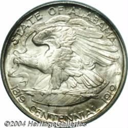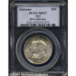 <B>1921<50C> Alabama 2x2 MS67 PCGS.</B></I> The state of Alabama joined the union in 1819 with its centennial celebration taking place in 1919. Both of these dates were incorporated into the design, despite the coining being issued in 1921. This variety, with 2x2 in the right obverse field, was created in an effort to increase sales and fund-raising. According to legislation, profits from this issue were destined to support historical and monumental projects. Today, we must question whether these projects actually took place.<BR> This is only the fourth time that we have offered a Superb Gem MS-67 example of this issue over the past dozen years. The obverse has pastel golden-heather toning with peripheral iridescence. The reverse is lighter gray with splashes of color. Beneath the toning, the surfaces display exceptional satiny luster. We cannot imagine a finer example for the connoisseur. Population: 4 in 67, 0 finer (6/04).<BR><I>Ex: FUN Signature Sale (Heritage, 1/01), lot 9050, which realized $26,162.50.</B></I><BR><I>From the JFS Collection, the #1 All-Time PCGS Registry Set.</B></I> <BR><BR><B>Important notice:</B> Heritage usually auctions material at the rate of 200-250 lots per hour. On some occasions eBay Live bid software or the Internet may not be able to keep up with the pace of the auction. We recommend placing a realistic absentee bid now as insurance to avoid disappointment. Occasionally the auctioneer may eliminate or reject an eBay Live bid, and the auctioneer may also reopen a lot after the close of the eBay live bidding (usually because we missed an audience bid), and may reject your bid even if it shows you as the winning bidder. By bidding via eBay Live, you agree that Heritage may award the lot to another bidder at its sole discretion under the circumstances described above or any other reasonable circumstances. Since eBay bids are not shown to us until we open the lot on the floor, we treat those bids just like floor bids. In most cases the floor responds before the eBay bid is presented to us, due to Internet lag time, so for consistency we have made it a policy that floor bids are always considered first over tie eBay live bids. Also please note that all Heritage lots purchased through eBay Live carry a 20% Buyer's Premium. Please make sure you read the Terms and Conditions before you bid. </span></font></tr></table></td></tr></table>