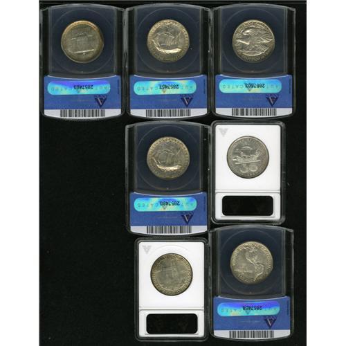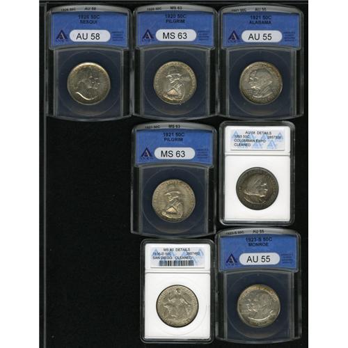 <B>1921<50C> Alabama AU55 ANACS,</B></I> ample luster, slight wear on the centers; <B>1893 Columbian--Cleaned--ANACS, AU58 Details,</B></I> lustrous but hairlined, peripheral aqua toning, the 3 in the date is lightly repunched; <B>1923-S Monroe AU55 ANACS,</B></I> friction on Adams' cheekbone confirms brief handling; <B>1920 Pilgrim MS63 ANACS,</B></I> wispy field marks below the motto, lemon and ice-blue patina; <B>1921 Pilgrim MS63 ANACS,</B></I> lustrous, attractive, gentle golden-gray toning; <B>1936-D San Diego--Cleaned--ANACS, MS60 Details,</B></I> lightly hairlined, medium chestnut and powder-blue tints; and a <B>1926 Sesquicentennial AU58 ANACS,</B></I> lustrous and pleasing for the grade.