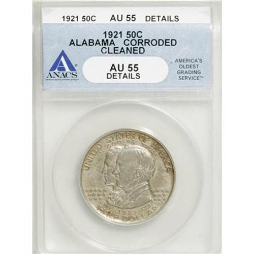 <B>1921 50C Alabama--Cleaned, Corroded--ANACS. AU55 Details.</B></I> NGC Census: (14/1586). PCGS Population (34/1946). Mintage: 59,038. Numismedia Wsl. Price for NGC/PCGS coin in AU55: $155. (#9224)<BR><BR><b>Shipping:</b> Coins & Currency (<a target="_blank" href="http://www.heritageauctions.com/common/shipping.php">view shipping information</a>)