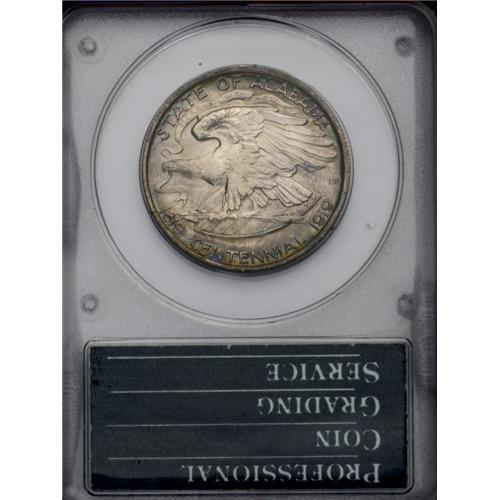 <B>1921<50C> Alabama MS63 PCGS.</B></I> Attractive luster radiates from multicolored surfaces. The design elements are sharply defined, though the eagle's right claw displays minor softness. Minute marks are noted on Kilby's cheek, and a couple of small cuts are visible on the obverse rim at 8 o'clock. Housed in a first generation PCGS holder. <BR><BR><B>Important notice:</B> Heritage usually auctions material at the rate of 200-250 lots per hour. On some occasions eBay Live bid software or the Internet may not be able to keep up with the pace of the auction. We recommend placing a realistic absentee bid now as insurance to avoid disappointment. Occasionally the auctioneer may eliminate or reject an eBay Live bid, and the auctioneer may also reopen a lot after the close of the eBay live bidding (usually because we missed an audience bid), and may reject your bid even if it shows you as the winning bidder. By bidding via eBay Live, you agree that Heritage may award the lot to another bidder at its sole discretion under the circumstances described above or any other reasonable circumstances. Since eBay bids are not shown to us until we open the lot on the floor, we treat those bids just like floor bids. In most cases the floor responds before the eBay bid is presented to us, due to Internet lag time, so for consistency we have made it a policy that floor bids are always considered first over tie eBay live bids. Also please note that all Heritage lots purchased through eBay Live carry a 20% Buyer's Premium. Please make sure you read the Terms and Conditions before you bid. This lot is being auctioned in conjunction with a live floor auction by Heritage Galleries & Auctioneers. All final auction and invoice information will be supplied by Heritage Galleries & Auctioneers, and all other information should be considered preliminary. Lot:4840 <BR><BR><B>Winning Notification and Billing:</B> After the FINAL session in this auction is complete, Heritage will send e-mail and snail mail invoices. This process normally takes several days. All final auction and invoice information will be supplied by Heritage Galleries & Auctioneers, and all other information should be considered preliminary. <BR><BR>This auction will be conducted on a live auction floor and over the Internet through eBay Live. If you choose to place an absentee bid, please take a moment to <font color='#0000ff'><u><a href='http://pages.ebay.com/liveauctions/help/before/laabsentee.html'>learn how eBay Live absentee bidding works</a></u></font><font color='#000000'>