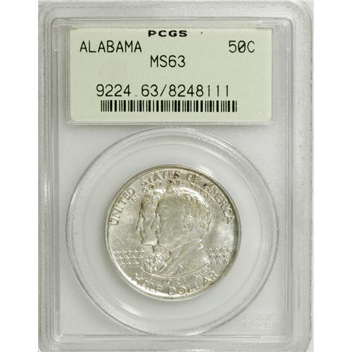 <B>1921 50C Alabama MS63 PCGS.</B></I> Traces of powder-blue and beige-gold are barely visible on lustrous surfaces. Generally well struck, save for the usual softness on the eagle's left leg. Minute handling marks on the obverse portraits define the grade. Housed in a green-label holder.<BR><BR><b>Shipping:</b> Coins & Currency (<a target="_blank" href="http://www.heritageauctions.com/common/shipping.php">view shipping information</a>)