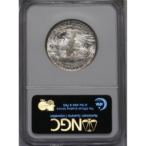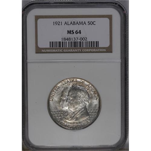 <B>1921<50C> Alabama MS64 NGC.</B></I> Variegated ice-blue and beige-gold patina rests over highly lustrous surfaces that display sharply impressed design elements. A couple of marks on Kilby's cheek limit the grade.