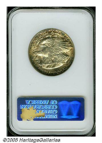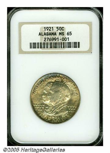 <B>1921<50C> Alabama MS65 NGC.</B></I> Original gray-brilliant patina covers both sides of this nearly pristine example. The usual strong mint frost underlies the deeper border toning that is seen on each side. A lovely and nearly unsurpassable specimen of this scarce commemorative Half.