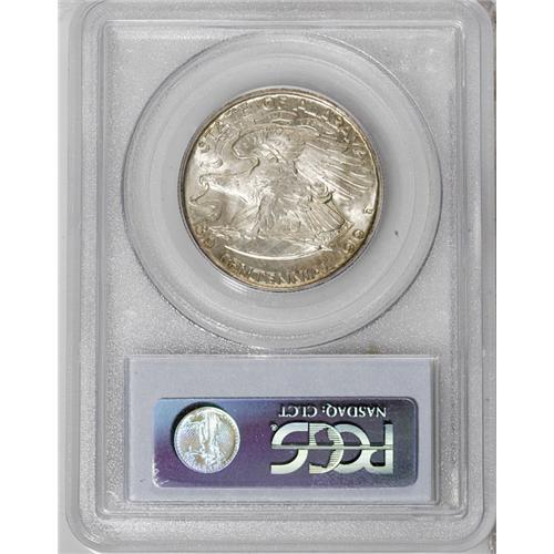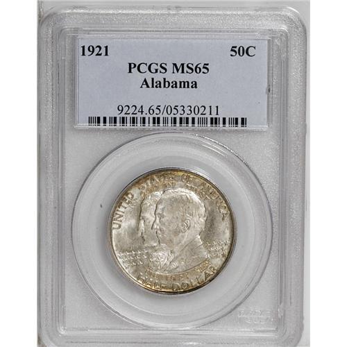 <B>1921<50C> Alabama MS65 PCGS.</B></I> A nicely preserved example of the more common Alabama variety. Delicate wisps of olive and russet patina visit the smooth, satiny surfaces. A few small marks limit the grade, but this remains a desirable Gem example of this classic silver commemorative.