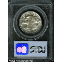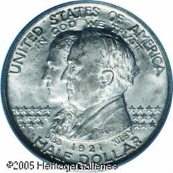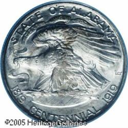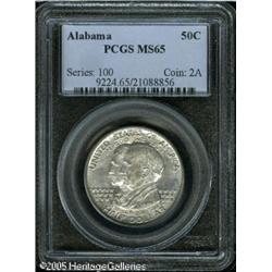 <B>1921 50C Alabama MS65 PCGS.</B></I> An impressive Gem example of this key commemorative half. What is most striking when first viewing this piece is the exceptionally thick mint frost. As one would expect, the surfaces are free from any distracting abrasions, and each side shows pale aqua-blue toning with a streak of golden down the center of the reverse. Lot:8422