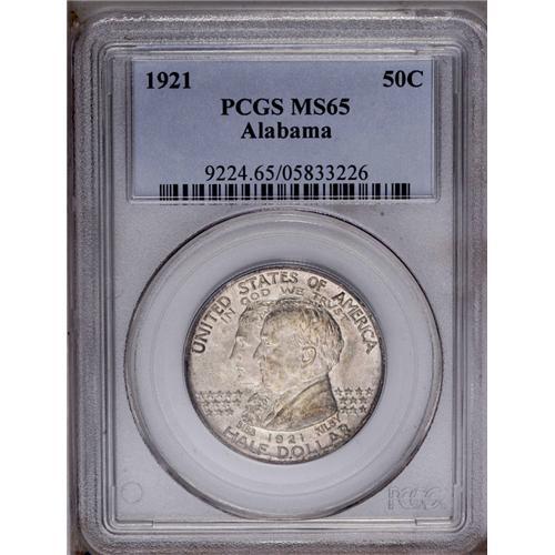 <B>1921<50C> Alabama MS65 PCGS.</B></I> The richly frosted surfaces retain some of the original mint brilliance, but each side also shows irregularly scattered portions of golden-russet and steel-gray toning. A lovely and unquestionably original coin.