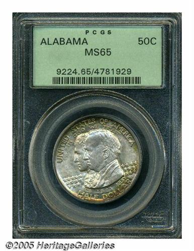 <B>1921<50C> Alabama MS65 PCGS.</B></I> This well preserved Gem was sharply impressed, and has only acquired a handful of trivial blemishes. The surfaces are primarily dove-gray in color, with some multicolored rainbow-like iridescence near the borders.