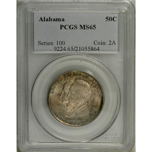 <B>1921 50C Alabama MS65 PCGS.</B></I> Typically defined with lustrous, well-preserved surfaces that show mottled, multicolored patina around the obverse and reverse legends. Overall, the eye appeal is strong.<BR><BR><b>Shipping:</b> Coin/Currency (<a target="_blank" href="http://www.heritageauctions.com/common/shipping.php">view shipping information</a>)