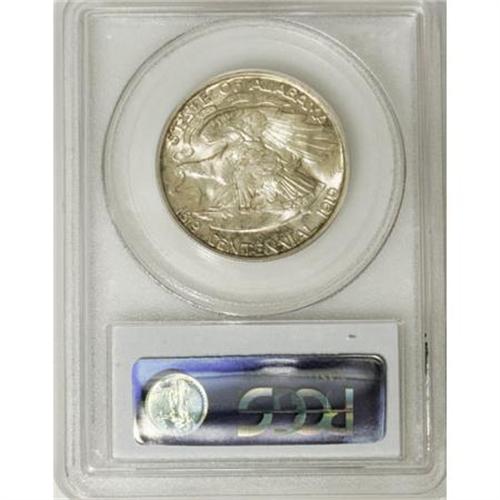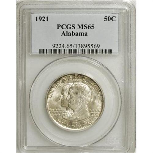 <B>1921 50C Alabama MS65 PCGS.</B></I> Well struck with intense luster and speckled green patina on the obverse and near the reverse border. The few faint surface blemishes are not excessive for a Gem. <BR><I>From The Frank DuVall Collection of U.S. Commemoratives.</B></I><BR><BR><b>Shipping:</b> Coins & Currency (<a target="_blank" href="http://www.heritageauctions.com/common/shipping.php">view shipping information</a>\)