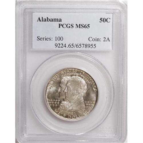 <B>1921 50C Alabama MS65 PCGS.</B></I> Well-defined for this statehood commemorative with whispers of tan and violet at the margins. A softly lustrous and pleasingly preserved Gem. PCGS has graded 69 finer pieces (11/07).<BR><I>From The Pinetop Collection.</B></I><BR><BR><b>Shipping:</b> Coins & Currency (<a target="_blank" href="http://www.heritageauctions.com/common/shipping.php">view shipping information</a>)