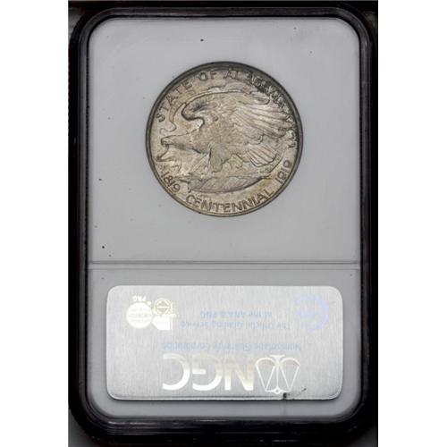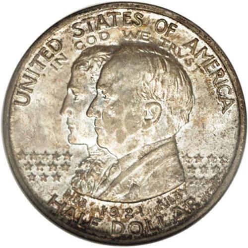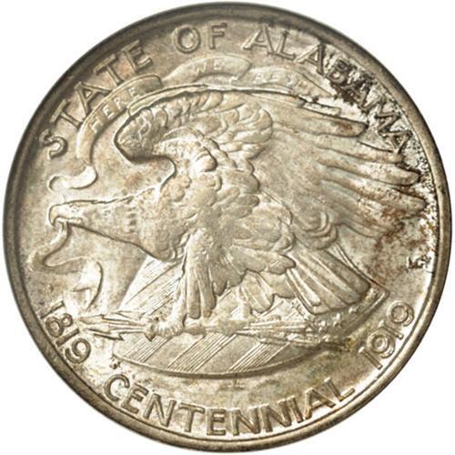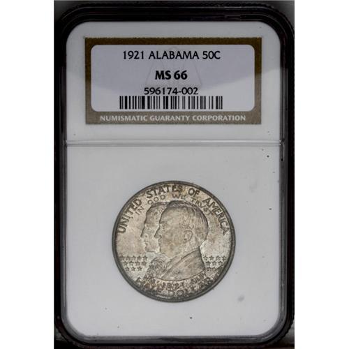 <B>1921<50C> Alabama MS66 NGC.</B></I> An admirable example with moderate auburn toning over lighter ivory surfaces, and fully lustrous with a finer than usual strike. A few minute marks are noted on Kilby's cheek. A little over 100 examples have been certified as Premium Gems, and only five pieces finer (3/06). <BR><BR><B>Important notice:</B> Heritage usually auctions material at the rate of 200-250 lots per hour. On some occasions eBay Live bid software or the Internet may not be able to keep up with the pace of the auction. We recommend placing a realistic absentee bid now as insurance to avoid disappointment. Occasionally the auctioneer may eliminate or reject an eBay Live bid, and the auctioneer may also reopen a lot after the close of the eBay live bidding (usually because we missed an audience bid), and may reject your bid even if it shows you as the winning bidder. By bidding via eBay Live, you agree that Heritage may award the lot to another bidder at its sole discretion under the circumstances described above or any other reasonable circumstances. Since eBay bids are not shown to us until we open the lot on the floor, we treat those bids just like floor bids. In most cases the floor responds before the eBay bid is presented to us, due to Internet lag time, so for consistency we have made it a policy that floor bids are always considered first over tie eBay live bids. Also please note that all Heritage lots purchased through eBay Live carry a 20% Buyer's Premium. Please make sure you read the Terms and Conditions before you bid. This lot is being auctioned in conjunction with a live floor auction by Heritage Galleries & Auctioneers. All final auction and invoice information will be supplied by Heritage Galleries & Auctioneers, and all other information should be considered preliminary. Lot:4844 <BR><BR><B>Winning Notification and Billing:</B> After the FINAL session in this auction is complete, Heritage will send e-mail and snail mail invoices. This process normally takes several days. All final auction and invoice information will be supplied by Heritage Galleries & Auctioneers, and all other information should be considered preliminary. <BR><BR>This auction will be conducted on a live auction floor and over the Internet through eBay Live. If you choose to place an absentee bid, please take a moment to <font color='#0000ff'><u><a href='http://pages.ebay.com/liveauctions/help/before/laabsentee.html'>learn how eBay Live absentee bidding works</a></u></font><font color='#000000'>