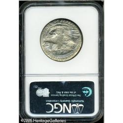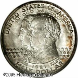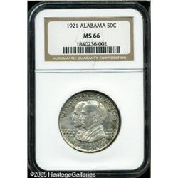 <B>1921 50C Alabama MS66 NGC.</B></I> Very well struck for this often poorly defined early commemorative and bathed in a natural silver-gray patina that gives way to occasional russet toning about the obverse periphery. Attractive and totally original. Population: 37 in 66, 4 finer (1/05). Lot:8425