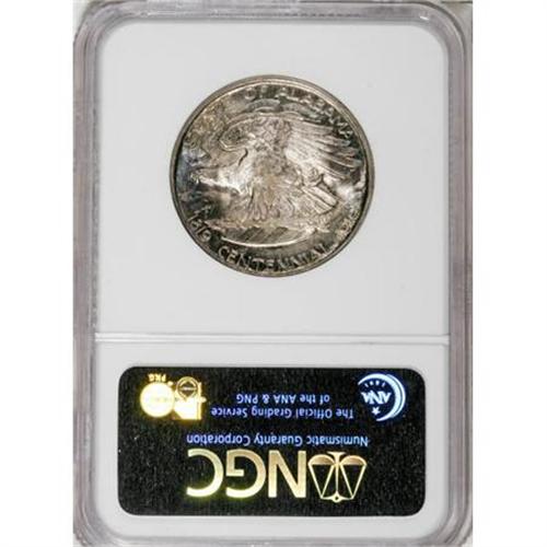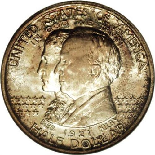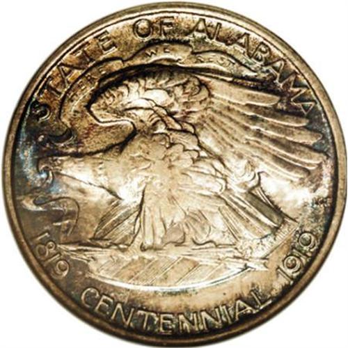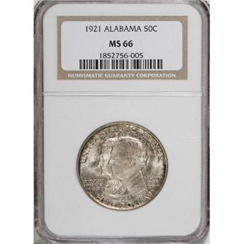 <B>1921 50C Alabama MS66 NGC.</B></I> This Premium Gem Alabama commemorative half presents a blend of radiant luster, a scattering of gray-gold toning on the obverse and cobalt-blue and mauve on the reverse, and well brought up design features. Areas of slight weakness on the eagle, as typically seen, are mentioned for accuracy, as are a few light marks on Kilby's cheek. NGC and PCGS have certified less than 10 specimens finer (7/7).<BR><BR><b>Shipping:</b> Coins & Currency (<a target="_blank" href="http://www.heritageauctions.com/common/shipping.php">view shipping information</a>\)