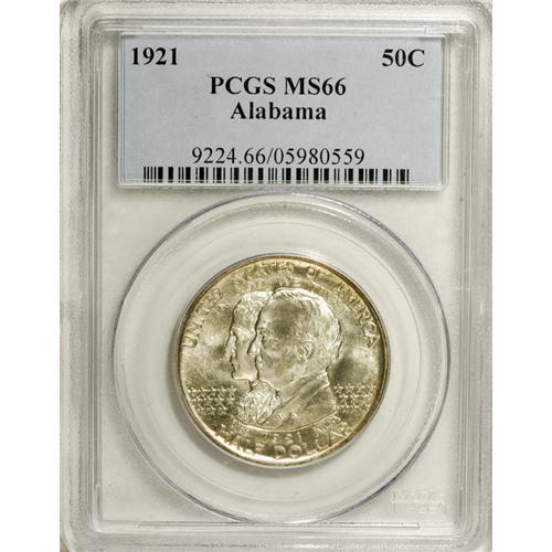 <B>1921 50C Alabama MS66 PCGS.</B></I> This is a remarkably clean and lustrous Premium Gem example of the Alabama half dollar, one of the earliest issues of the silver commemorative series. This is the "plain" variety, without "2x2" in the right obverse field. Well struck and virtually blemish-free, with a few faint die striations (as struck) noted in the left obverse fields. Population: 65 in 66, 1 finer (1/07).<BR><BR><b>Shipping:</b> Coins & Currency (<a target="_blank" href="http://www.heritageauctions.com/common/shipping.php">view shipping information</a>)