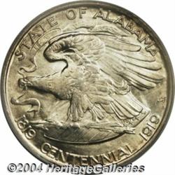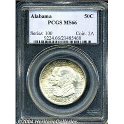 <B>1921<50C> Alabama MS66 PCGS.</B></I> An outstanding Alabama Half in overall terms. The mint luster is exceptionally bright and frosted, there are no obvious abrasions on the faces of Bibb or Kilby, and each side retains most of the original mint brilliance with a small arc of golden-russet and blue above and below the jugate portraits. Population: 51 in 66, 0 finer (4/04). <BR><BR><B>Important notice:</B> Heritage usually auctions material at the rate of 200-250 lots per hour. On some occasions eBay Live bid software or the Internet may not be able to keep up with the pace of the auction. We recommend placing a realistic absentee bid now as insurance to avoid disappointment. Occasionally the auctioneer may eliminate or reject an eBay Live bid, and the auctioneer may also reopen a lot after the close of the eBay live bidding (usually because we missed an audience bid), and may reject your bid even if it shows you as the winning bidder. By bidding via eBay Live, you agree that Heritage may award the lot to another bidder at its sole discretion under the circumstances described above or any other reasonable circumstances. Since eBay bids are not shown to us until we open the lot on the floor, we treat those bids just like floor bids. In most cases the floor responds before the eBay bid is presented to us, due to Internet lag time, so for consistency we have made it a policy that floor bids are always considered first over tie eBay live bids. Also please note that all Heritage lots purchased through eBay Live carry a 20% Buyer's Premium. Please make sure you read the Terms and Conditions before you bid. </span></font></tr></table></td></tr></table>