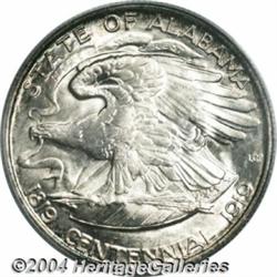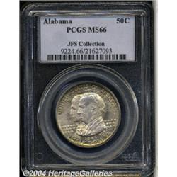 <B>1921<50C> Alabama MS66 PCGS.</B></I> Hints of russet-gold color grace the fields of this lustrous premium Gem. The fields are well preserved, and the cheek of Governor Kilby is only lightly marked. The eagle's front leg is not fully struck, as is characteristic of the issue, but the portraits are bold. Population: 51 in 66, 0 finer (3/04).<BR><I>From the JFS Collection, the #1 All-Time PCGS Registry Set.</B></I> <BR><BR><B>Important notice:</B> Heritage usually auctions material at the rate of 200-250 lots per hour. On some occasions eBay Live bid software or the Internet may not be able to keep up with the pace of the auction. We recommend placing a realistic absentee bid now as insurance to avoid disappointment. Occasionally the auctioneer may eliminate or reject an eBay Live bid, and the auctioneer may also reopen a lot after the close of the eBay live bidding (usually because we missed an audience bid), and may reject your bid even if it shows you as the winning bidder. By bidding via eBay Live, you agree that Heritage may award the lot to another bidder at its sole discretion under the circumstances described above or any other reasonable circumstances. Since eBay bids are not shown to us until we open the lot on the floor, we treat those bids just like floor bids. In most cases the floor responds before the eBay bid is presented to us, due to Internet lag time, so for consistency we have made it a policy that floor bids are always considered first over tie eBay live bids. Also please note that all Heritage lots purchased through eBay Live carry a 20% Buyer's Premium. Please make sure you read the Terms and Conditions before you bid. </span></font></tr></table></td></tr></table>
